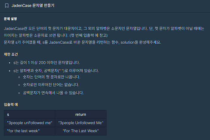 i - 1번째 요소가 공백인지를 확인하면 되는데, i = 0일 때 에러가 나기 때문에 s[0]은 따로 판별해주었다.