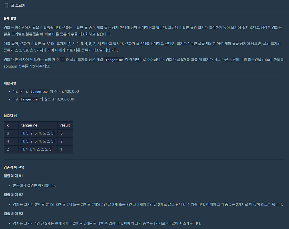 tangerine = [1, 3, 2, 5, 4, 5, 2, 3] 일 때 수확한 귤 8개 중, 크기가 2인 귤 2개 + 크기가 3인 귤 2개 + 크기가 5인 귤 2개 = 6개 = k (귤 종류는 3가지로 정답)